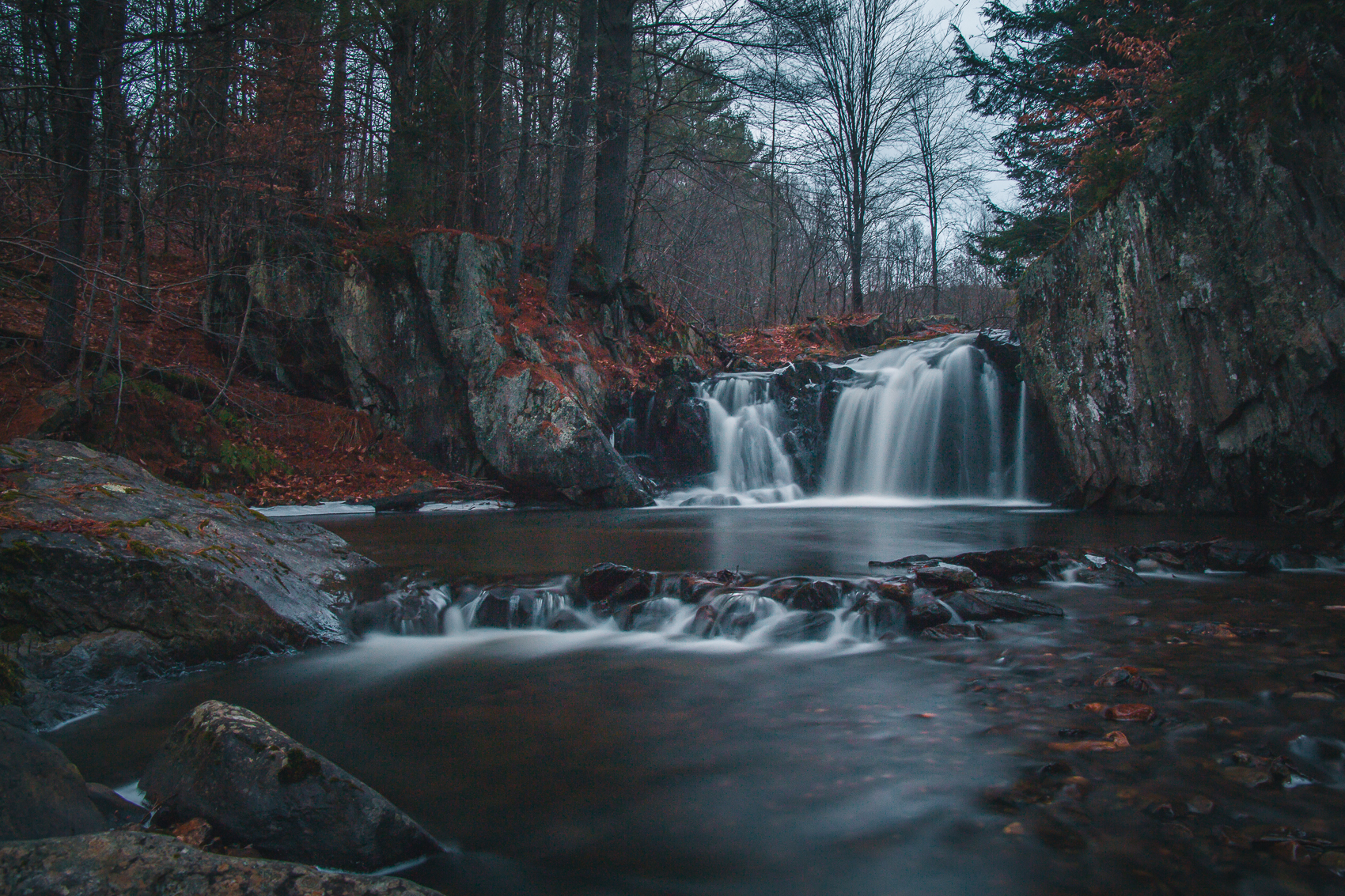 We managed to climb our way back up the drop. First, I set my camera up there, then with both arms I lifted myself up the rock. Izzy followed and I gave her a hand. We headed further down the brook, coming to another beautiful area that I had shot photos at before. We found a safe way down, and gazed our eyes upon a rounded rock as a centerpiece.